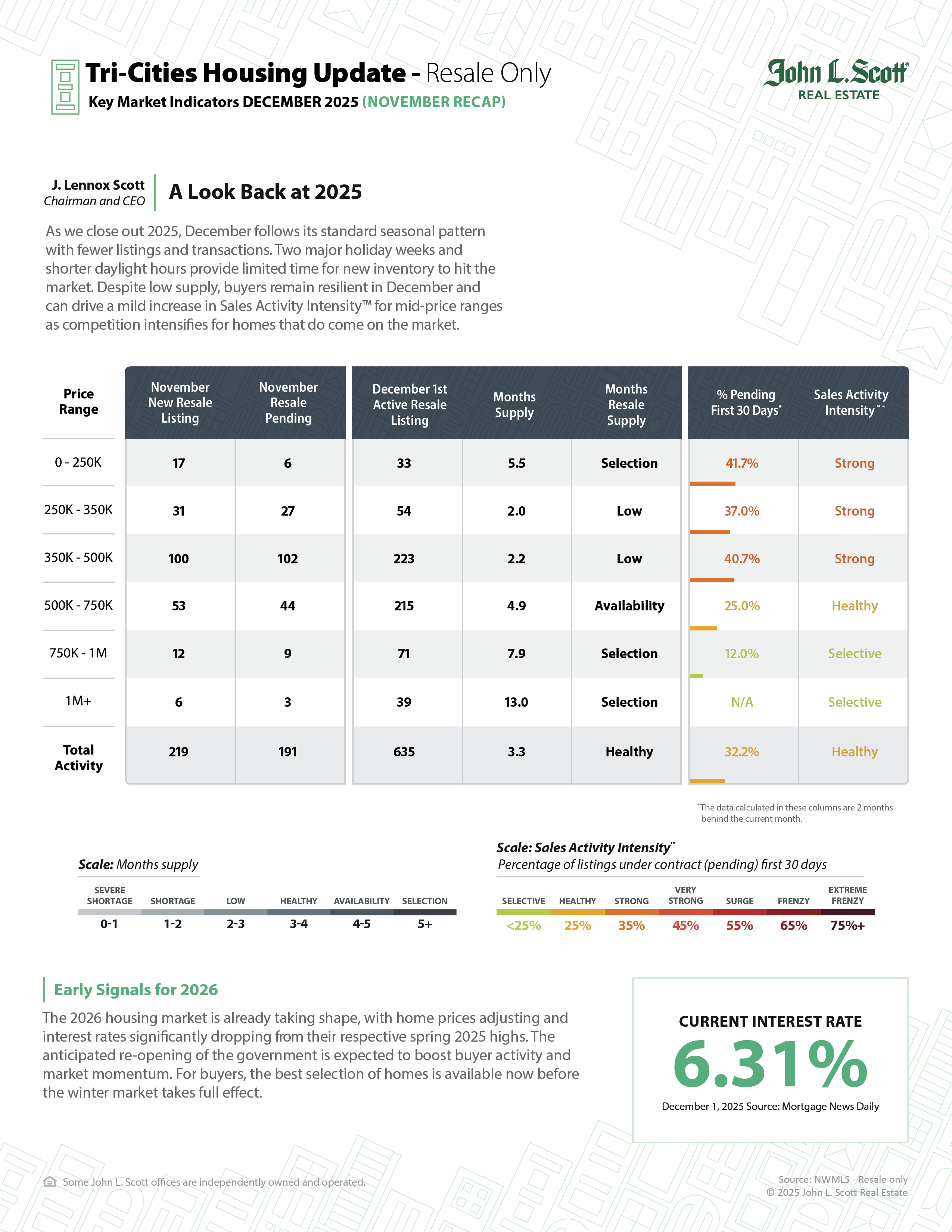 As we close out 2025, December follows its standard seasonal pattern with fewer listings and transactions. Two major holiday weeks and shorter daylight hours provide limited time for new inventory to hit the market. Despite low supply, buyers remain resilient in December and can drive a mild increase in Sales Activity Intensity™ for mid-price ranges as competition intensifies for homes that do come on the market.
